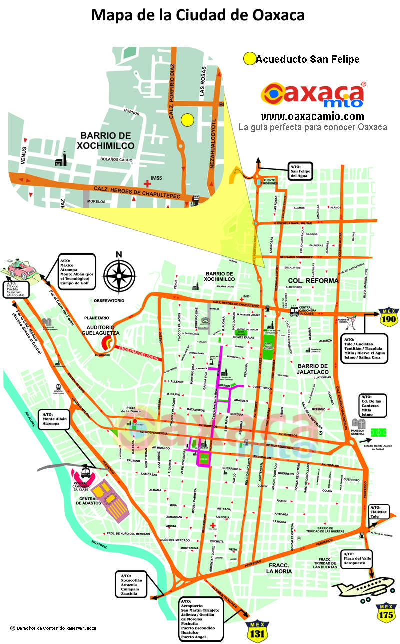 La gran obra comprendió desde la toma de agua, en los manantiales del cerro de San Felipe, al norte de la ciudad; pasó por este sitio, denominado "La Cascada", en el barrio de Xochimilco, hasta llegar a la caja de agua, ubicada en la esquina del templo del Carmen Alto, a unas cuantas cuadras al norte del Centro Histórico de Oaxaca; en la caja aún se aprecia la frase: "Acabóse esta obra en el año de 1751". "La Cascada" o "Pozas Arcas" es uno de los sitios mas vistosos del acueducto, debido a su altura y sus arcos que cruzan el antiguo río de Jalatlaco, que no hace mucho tiempo, aún formaba una serie de pozas y una bella cascada, motivos que dieron su denominación. Actualmente, este tramo fue rescatado por el ayuntamiento de la ciudad, quien lo restauró, y en su entorno creo un agradable parque recreativo. El mejor punto visual para la contemplación de este monumento histórico es la calle José López Alavez, parte alta del barrio de Xochimilco. |