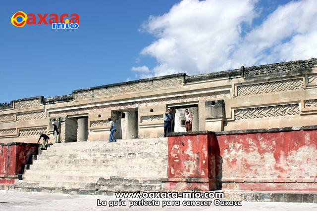 El gran Salón de las Columnas es de planta rectangular. Por este salón se penetra al palacio principal a través de una estrecha puerta. Al salir del pasadizo nos encontramos en el patio de las grecas, desde donde tendremos acceso a cada uno de los cuatro salones, decorados por tres tableros con mosaicos de grecas de piedra labrada que forman diferentes dibujos geométricos en cada banda; las grecas están formadas por miles de tabletas de piedra pulida, engarzadas entre sí sin ninguna mezcla.